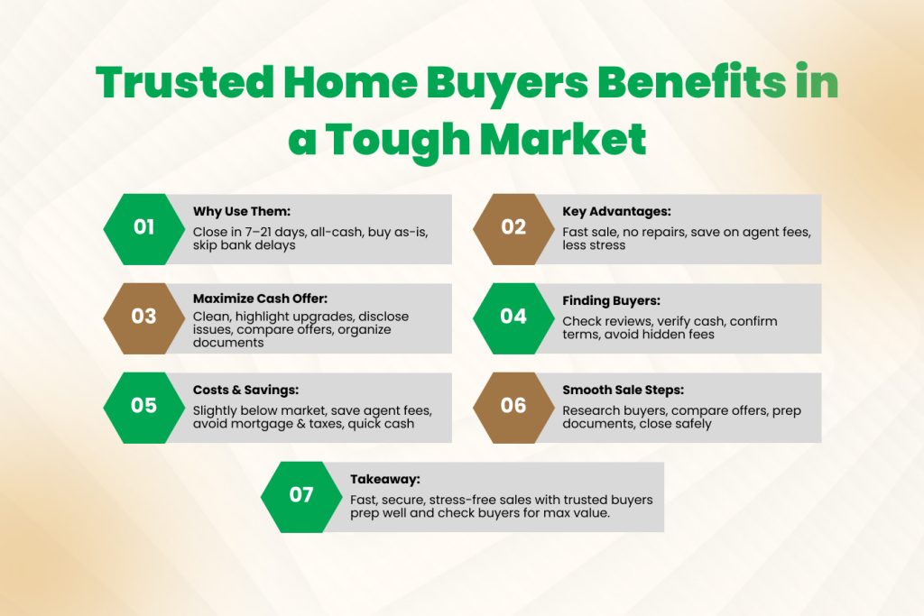 Working with trusted home buyers is a reliable way to sell a home in a tough market. They provide fast transactions, reduce stress, and ensure financial certainty. Preparing your home, comparing multiple offers, and choosing verified buyers allows homeowners to complete a smooth sale. By using trusted home buyers, sellers can navigate a challenging market with confidence and efficiency.